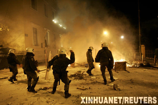 12月8日,防暴警察在希臘首都雅典的一個著火現場。雅典市中心地區的騷亂爆發于6日晚,目前有升級趨勢。 新華社/路透