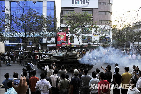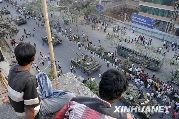 2月26日,在孟加拉國首都達卡街頭,部隊正在開往步槍隊總部。新華社發(扎曼攝)