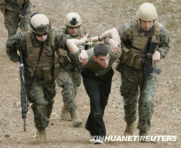 3月9日,在韓國首都首爾東南410公里的鎮海美軍基地,美國海軍陸戰隊太平洋反恐安全小組的成員模擬抓捕“入侵者”。新華社/路透