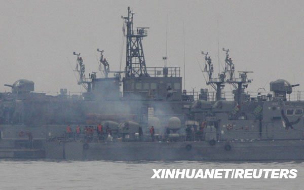 3月9日,參加演習的韓國海軍的軍艦在延平島海域拋錨。新華社/路透