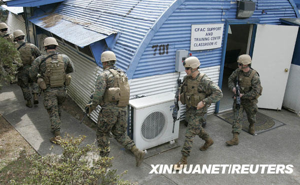 3月9日,在韓國首都首爾東南410公里的鎮海美軍基地,美國海軍陸戰隊太平洋反恐安全小組參加演習。新華社/路透
