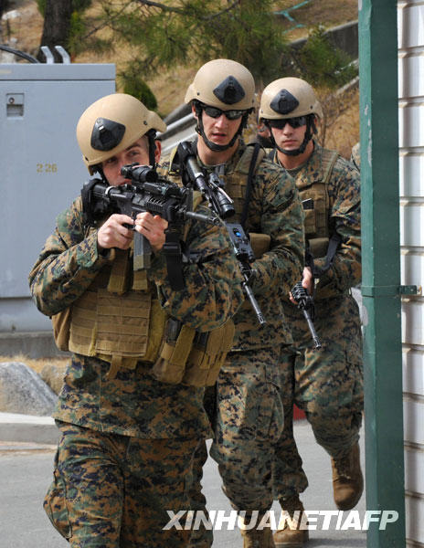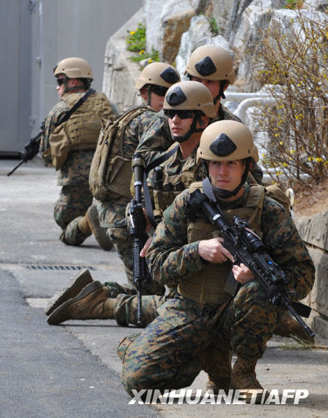 3月9日,在韓國首都首爾東南410公里的鎮海美軍基地,美國海軍陸戰隊太平洋反恐安全小組參加演習。
