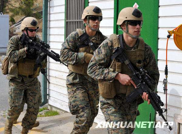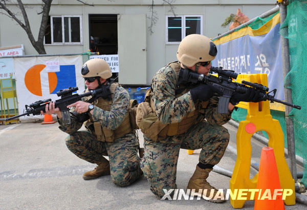 3月9日,在韓國首都首爾東南410公里的鎮海美軍基地,美國海軍陸戰隊太平洋反恐安全小組參加演習。新華社/法新