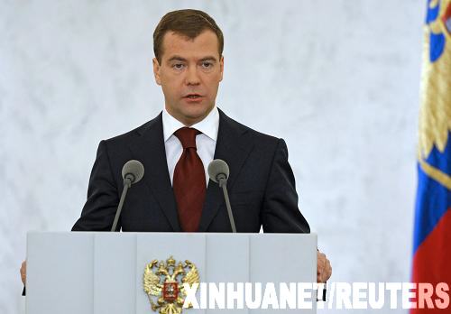 2008年11月5日,俄羅斯總統梅德韋杰夫在首都莫斯科的克里姆林宮向議會兩院發表國情咨文時提議,將俄總統任期從目前的4年延長至6年,將國家杜馬(議會下院)議員任期從4年延長至5年。新華社/路透