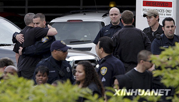 3月21日,在美國加利福尼亞州的奧克蘭市,兩名警察在醫(yī)院門口等候受傷同事的消息時(shí)安慰對(duì)方。