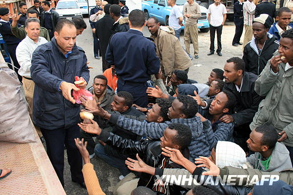 3月29日,利比亞警察向沉船事件的獲救者分發食物。新華社/法新