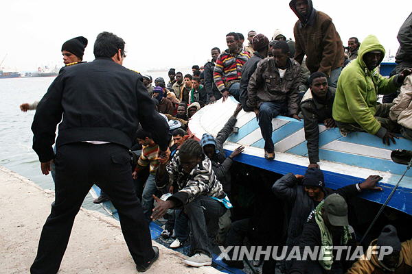 3月29日,在利比亞首都的黎波里,警察幫助沉船事件的獲救者上岸。國際移民組織官員3月31日說,3艘載有非洲移民的船只29日和30日在利比亞附近海域沉沒,約300人失蹤。新華社/法新