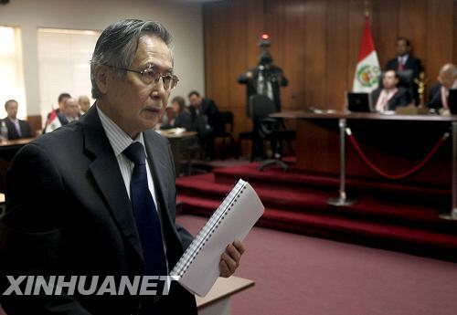 4月7日,在秘魯首都利馬,秘魯前總統藤森出庭接受審判。當日,秘魯最高法院特別法庭以參與兩起綁架殺人案、犯有“踐踏人權罪”判處秘魯前總統藤森25年監禁。新華社發
