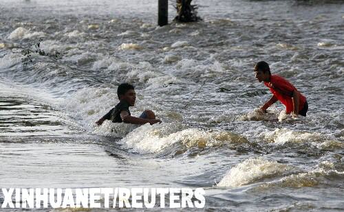 5月7日,在巴西東北部皮奧伊州的埃斯佩蘭蒂納,孩子們在被洪水淹沒的街道上玩耍。巴西有關部門表示,多日來暴雨導致的洪水和泥石流已經造成至少33人死亡,21.4萬人無家可歸。 新華社/路透