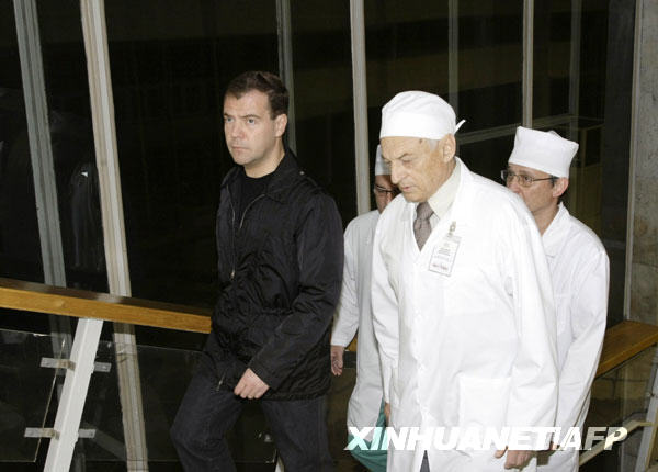 6月23日,在俄羅斯首都莫斯科,俄總統(tǒng)梅德韋杰夫(左一)在醫(yī)生陪同下探望身受重傷的俄羅斯印古什共和國總統(tǒng)尤努斯·貝克·葉夫庫羅夫。葉夫庫羅夫的車隊22日上午在印古什共和國首府納茲蘭市附近遭自殺式汽車炸彈襲擊,造成多人死傷,他本人也身受重傷。新華社/法新