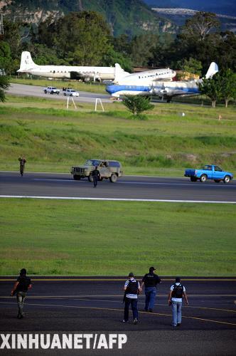 7月5日,洪都拉斯被罷免總統(tǒng)塞拉亞乘坐的飛機(jī)飛抵洪特古西加爾巴國際機(jī)場上空,但洪臨時(shí)政府軍隊(duì)在跑道上設(shè)置障礙,阻止其降落。新華社/法新