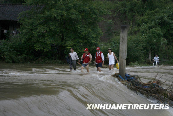 7月6日,在越南北部北件省,紅十字會志愿者在被洪水淹沒的道路上跋涉。越南防洪指導委員會當日說,肆虐3天的山洪已造成至少20人死亡,18人失蹤,越南北部多處道路和房屋損毀。新華社/路透