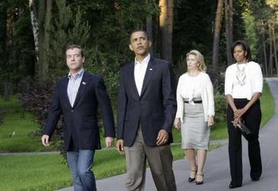 7月6日,俄羅斯總統(tǒng)梅德韋杰夫在莫斯科與到訪的美國(guó)總統(tǒng)奧巴馬舉行會(huì)談。奧巴馬當(dāng)日抵達(dá)莫斯科進(jìn)行為期三天的訪問(wèn),這是他就任總統(tǒng)以來(lái)首次訪問(wèn)俄羅斯。