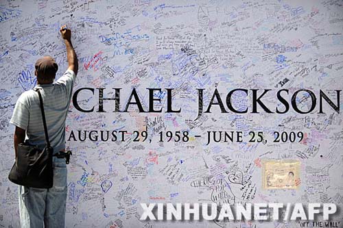7月5日,在美國洛杉磯市中心的斯臺普斯中心門口,一名歌迷在邁克爾·杰克遜的海報上簽名。新華社/法新