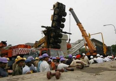 起重機在地鐵高架橋坍塌事故現場倒塌