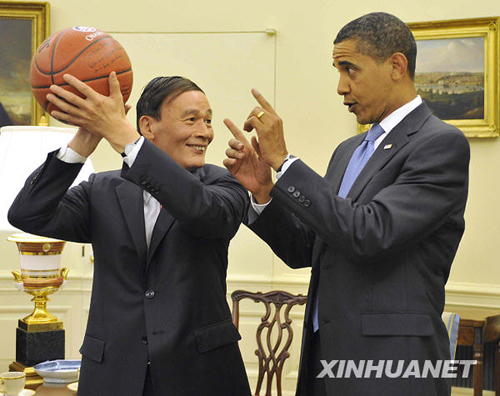 7月28日,美國總統奧巴馬在首都華盛頓白宮會見正在華盛頓出席首輪中美戰略與經濟對話的中國國家主席胡錦濤特別代表、國務院副總理王岐山和國務委員戴秉國一行。這是奧巴馬(右)向王岐山贈送籃球。新華社記者張巖攝