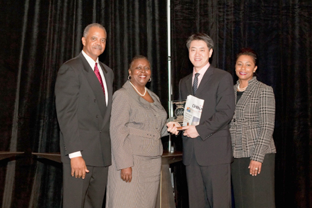 美國商務(wù)部少數(shù)族裔企業(yè)發(fā)展署東南地區(qū)主任PATRICIA HANES及同事向中國日報北美總經(jīng)理曹青頒獎