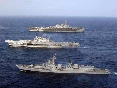 印度“維特拉”號航空母艦與“邁索爾”號驅逐艦同美海軍“尼米慈”號航空母艦在印度洋進行聯合演習。