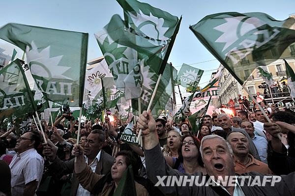 泛希運(yùn)動(dòng)的支持者在首都雅典街頭狂歡慶祝。帕潘德里歐大選前承諾,投入45億美元刺激希臘經(jīng)濟(jì),并投資發(fā)展清潔能源,包括太陽(yáng)能、風(fēng)力發(fā)電等。