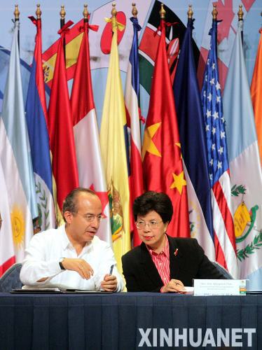 資料圖片:2009年7月2日,在墨西哥海濱城市坎昆,世界衛(wèi)生組織總干事陳馮富珍(右)和墨西哥總統(tǒng)卡爾德龍?jiān)谑澜缧l(wèi)生部長峰會開幕式上交談。當(dāng)日,世界衛(wèi)生部長峰會在這里開幕。與會人員在此次峰會上共商應(yīng)對全球甲型H1N1流感大流行,共享防控信息,討論防控的經(jīng)驗(yàn)及教訓(xùn)。新華社發(fā)(伊麗莎白·路易斯攝)