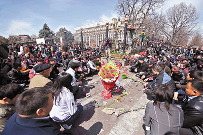 吉爾吉斯民眾在首都比什凱克市中心的總統(tǒng)府前敬獻鮮花,悼念76名遇難者。