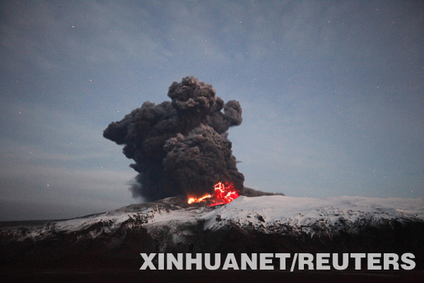 4月17日,冰島埃亞菲亞德拉冰蓋火山持續(xù)噴發(fā)。冰島南部火山日前再次噴發(fā)所產(chǎn)生的大量火山煙塵嚴(yán)重影響了歐洲地區(qū)的空中交通,導(dǎo)致多個(gè)國家機(jī)場(chǎng)關(guān)閉,大量航班被取消。新華社/路透