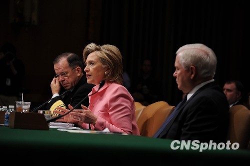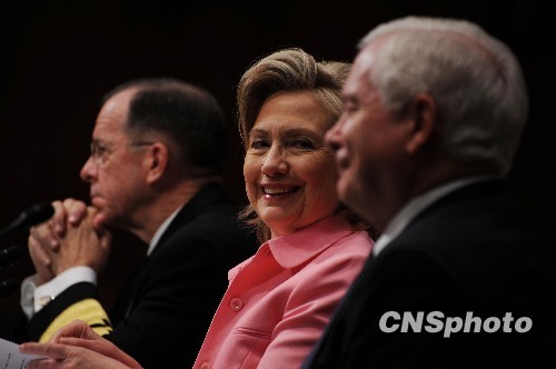 美國參議院外交委員會(huì)18日就新的美俄核裁軍條約舉行聽證會(huì)。希拉里在聽證會(huì)上表示,美國、中國和俄羅斯已經(jīng)就制裁伊朗的聯(lián)合國決議草案達(dá)成一致。圖為美國國務(wù)卿希拉里(中)、國防部長蓋茨(右)和美軍參謀長聯(lián)席會(huì)議主席邁克·馬倫(左)到場(chǎng)作證。 中新社發(fā) 吳慶才 攝