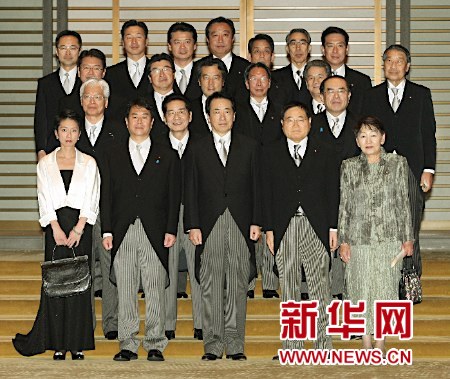 6月8日晚,日本天皇在天皇宮中舉行儀式,任命菅直人擔(dān)任日本新首相,同時(shí)一一任命了其它17名大臣。圖為菅直人率閣員合影。
