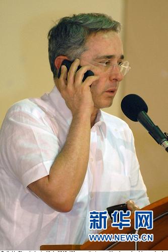 6月13日,哥倫比亞總統烏里韋在西部喬科省的一個政府工作會議上與武裝部隊司令奧斯卡·岡薩萊斯通電話。當日,烏里韋總統接到政府軍司令奧斯卡·岡薩萊斯的電話報告,稱哥倫比亞軍方經過激戰,從該國最大反政府武裝“哥倫比亞革命武裝力量”手里成功解救出被劫持為人質長達12年的門迪埃達將軍和恩里格·穆里奧上校。新華社發(哥總統府新聞處)