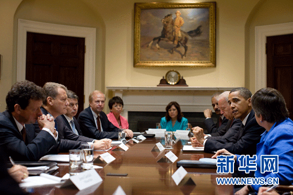 6月16日,在美國首都華盛頓白宮,美國總統(tǒng)奧巴馬(右二)會見英國石油公司高層。英國石油公司當(dāng)天表示,將拿出200億美元建立墨西哥灣石油泄漏事件賠償基金。新華社發(fā)(白宮新聞處)