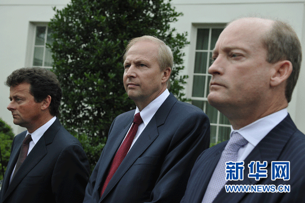 6月16日,在美國首都華盛頓白宮,英國石油公司首席執(zhí)行官托尼·海沃德(左)、總經(jīng)理羅伯特·達(dá)德利(中)和英國石油公司美國分公司總裁拉馬爾·麥凱與媒體見面。新華社記者張軍攝