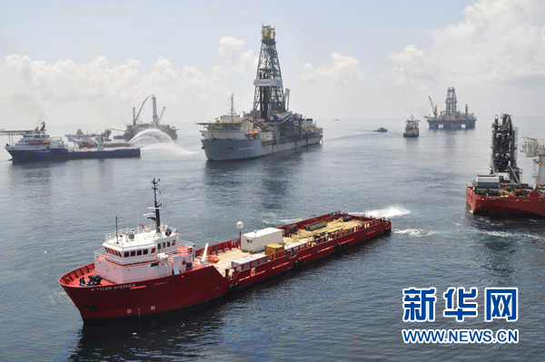 這張攝于6月15日的照片顯示,船只在墨西哥灣“深水地平線”鉆井平臺泄漏現(xiàn)場清理原油。英國石油公司16日表示,將拿出200億美元建立墨西哥灣石油泄漏事件賠償基金。新華社發(fā)(美國海岸警衛(wèi)隊(duì)/鮑勃·勞拉攝)