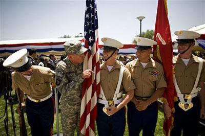 在駐阿多國部隊總部外舉行的就職儀式上,彼得雷烏斯接過一面美國旗和一面北約旗幟,正式接掌13萬多的美國和北約駐阿富汗部隊。