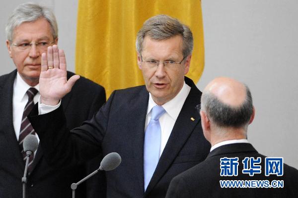7月2日,德國新任總統武爾夫(中)在首都柏林正式宣誓就職。德國第十任總統武爾夫當日在德國聯邦議院和聯邦參議院全體大會上宣誓就職。這位德國歷史上最年輕的總統承諾,他將致力于在社會各階層間構筑橋梁。 新華社/法新