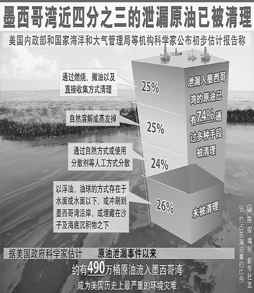 在處理漏油危機(jī)期間,英國(guó)石油公司在海面和海底共使用了180萬(wàn)加侖(1加侖約合3.79升)的化學(xué)分散劑。美國(guó)食品和藥物管理局副局長(zhǎng)珍妮·艾爾蘭上周表示,分散劑成分并沒(méi)有在墨西哥灣的魚(yú)類(lèi)體內(nèi)顯著堆積,即使魚(yú)類(lèi)用鰓吸入了這種化學(xué)物質(zhì),它們體內(nèi)也不會(huì)存留。