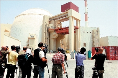 8月21日,攝影記者在布什爾核電站反應堆外拍照。