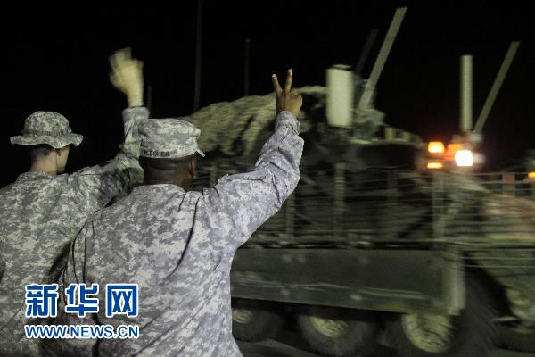 8月19日凌晨,2名美軍士兵向正在跨越伊拉克與科威特的邊境線撤離的美軍部隊揮手。美國媒體18日晚報道,最后一批駐伊美軍戰斗部隊已跨越伊拉克與科威特的邊境,美國完成了在8月31日前從伊拉克撤出戰斗部隊的計劃。 新華社/美聯