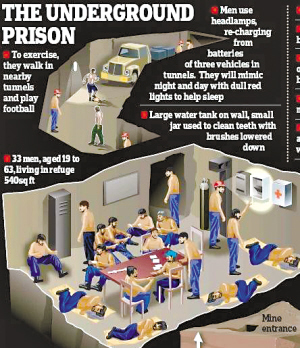 據英國和智利媒體28日報道,智利圣何塞銅礦33名礦工被困井下700米處的“杯具”牽動著世人的心。不為人知的是,其中一位名叫巴斯托斯的40歲男子猶如遭遇“死亡魔咒”:6個月前,他和妻兒剛剛逃過里氏8.8級的百年大地震,又因為改行當礦工遇上礦井坍塌,與其他32名工友被困井下。雖然由于挖掘進度奇慢,巴斯托斯等人最早要到圣誕節方能重見天日,可是他的妻子卻早已在礦井外安營扎寨,樂觀地期盼著夫妻團聚的那一天。