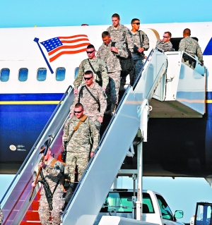 28日,又一批美國士兵乘坐軍機從伊拉克戰場上歸來。