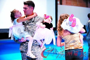 28日,一名離家整整一年的駐伊美軍士兵終于迎來了與妻子和女兒的相聚。