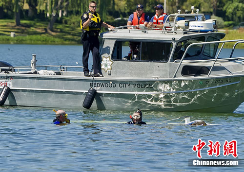 當地時間9月2日,一架剛起飛30秒的雙引擎比奇65皇后小飛機近中午時分墜落在美國加州舊金山灣區中半島的一個人工湖中。中新社發 陳鋼 攝