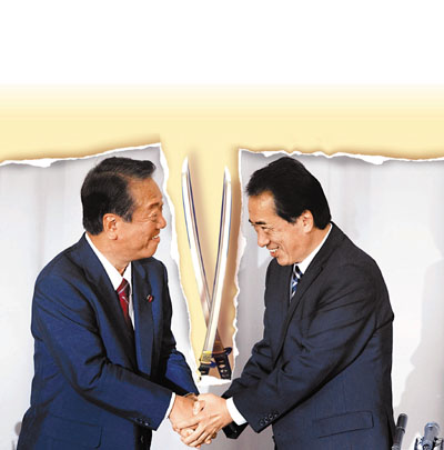 資料圖片:菅直人(右)與小澤一郎爭做黨魁火藥味濃。