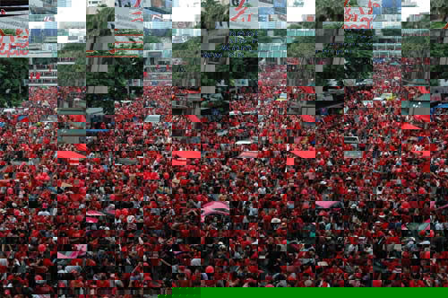 紅色的氣球上,畫(huà)著大大的問(wèn)號(hào),被放向藍(lán)色的天空,白色的粉筆在地上畫(huà)出死者的輪廓,震耳的鞭炮聲絲毫不亞于4個(gè)月前密集的槍聲。曼谷,拉差巴頌,又迎來(lái)了近萬(wàn)名身著紅衫的“紅衫軍”。9月19日,是5月19日“紅衫軍”集會(huì)被驅(qū)散4個(gè)月和2006年9月16日推翻他信政府的軍事政變4周年,“紅衫軍”一邊敲鑼打鼓,一邊在沿途樹(shù)干上捆綁紅色絲帶,呼喊著“嚴(yán)懲兇手”、“政府下臺(tái)”等口號(hào)。下午5:00,“紅衫軍”放出上萬(wàn)個(gè)氣球,希望把對(duì)政治沖突中死亡者的思念帶到天際。傍晚6:00,“紅衫軍”點(diǎn)亮蠟燭,寄托哀思,要求政府釋放在押的“紅衫軍”領(lǐng)導(dǎo)人,進(jìn)行司法和土地改革。