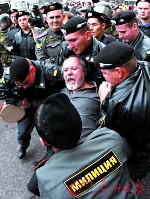 12日,一名要求盧日科夫下臺的抗議者在莫斯科集會時被警察逮捕。