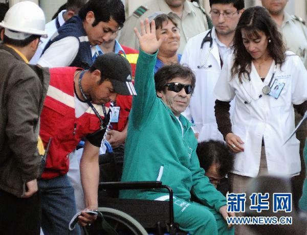 10月13日,第21名獲救礦工永尼·巴里奧斯(中)抵達智利科皮亞波地區醫院時向人們揮手致意。智利圣何塞銅礦最后一名被困礦工路易斯·烏爾祖阿當地時間13日晚成功升井獲救。至此,該銅礦33名被困礦工全部順利獲救。新華社發(尼古拉斯·塞拉亞攝)