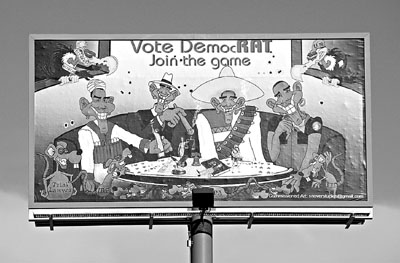 一幅位于美國科羅拉多州梅薩縣的大型選舉廣告牌惹來爭議。該廣告牌將奧巴馬描繪成伊斯蘭自殺式炸彈襲擊狂徒、同性戀者、抽雪茄的歹徒和墨西哥土匪,并畫上幾只身上寫上律師、美國國家稅務局(IRS)、國家環境保護署(EPA)和美聯儲的大老鼠,諷刺他們和奧巴馬蛇鼠一窩。