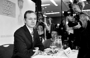 10月23日,倫敦,“維基解密”網站創始人朱利安·阿桑奇參加記者會,向媒體通報美軍伊拉克戰爭秘密文件。