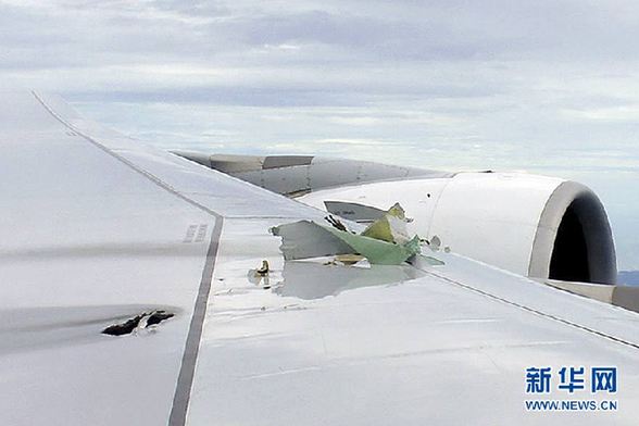 這是11月4日拍攝的澳大利亞航空公司的發(fā)生引擎故障的A380客機(jī)左側(cè)機(jī)翼。歐洲飛機(jī)制造商空中客車公司當(dāng)天發(fā)表新聞公報(bào),確認(rèn)澳大利亞航空公司的這架空客A380客機(jī)4日在執(zhí)行新加坡至悉尼航線飛行任務(wù)時(shí),引擎發(fā)生故障,后緊急迫降。新華社/路透