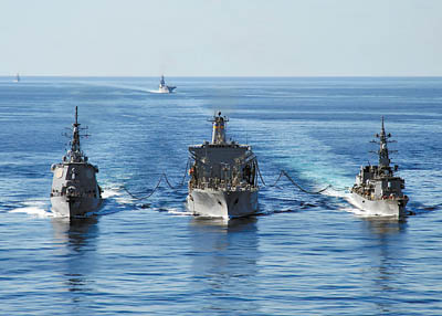 12月4日,美日艦隊正在舉行軍演。美軍“喬治·華盛頓”號航空母艦編隊中的“蒂珀·卡努”號補給船(T-AO199)給日本海上自衛隊“村雨”級驅逐艦DD-107“雷”號和“金剛”級導彈驅逐艦DDG-173“金剛”號加油。