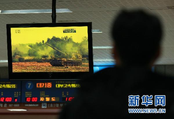 12月20日,一名男子在韓國仁川港觀看電視上播放的延坪島情況。當日,從仁川港出發至延坪島的航班因射擊演習而延期。韓國軍方20日決定當天在延坪島附近海域舉行實彈射擊訓練。演習將在“北方界線”以南的韓方海域進行。目前,島上除軍隊外,還有居民、記者、公職人員等280多人。軍方已經通過廣播向當地民眾下達了緊急躲避令。新華社發(樸真熙攝)